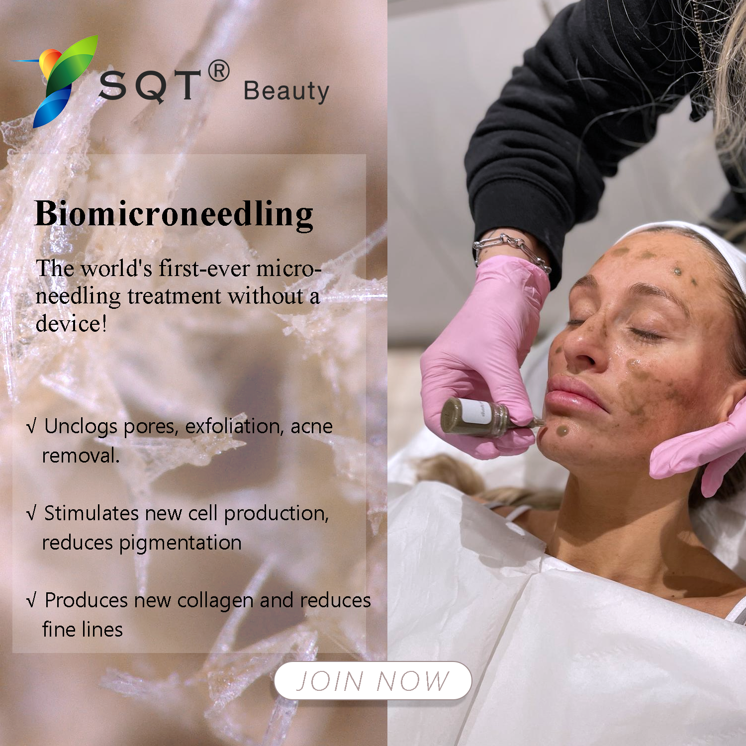 SQT BioMicroneedling is an advanced, natural skin treatment that stimulates collagen production, improves skin texture, reduces acne scars, pigmentation, fine lines, and helps achieve a smoother, brighter, healthier complexion — all without needles or chemicals.